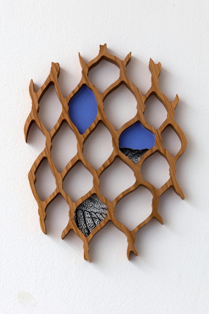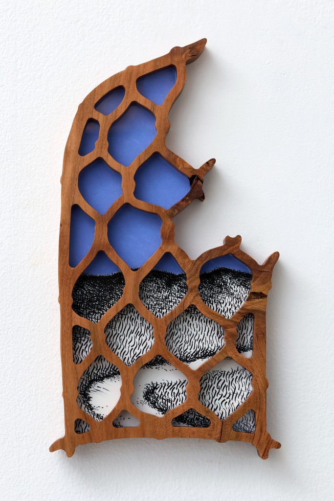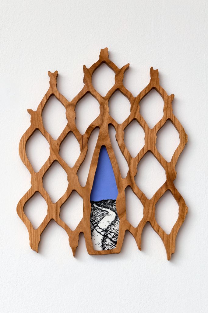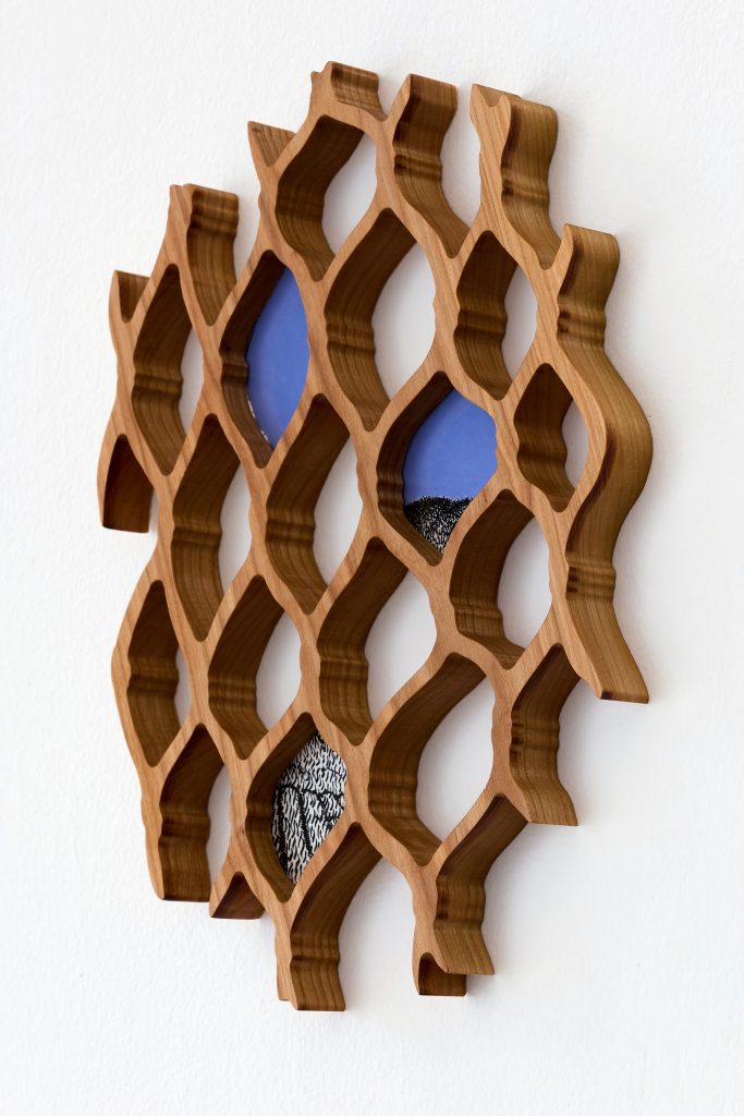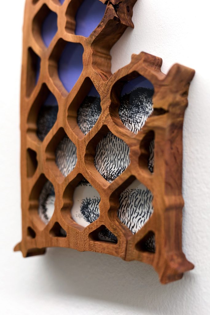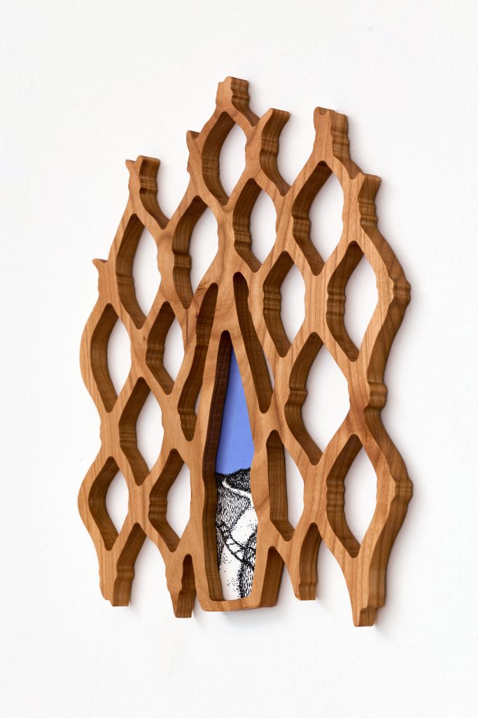 cherry tree wood, ink, acrylic paint, plexiglass, danish oil